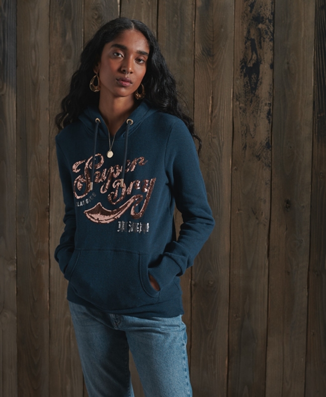 Modrá dámská mikina značky Superdry. Mikina má slim-fit střih a vpředu ji zdobí logo Superdry s flitry.