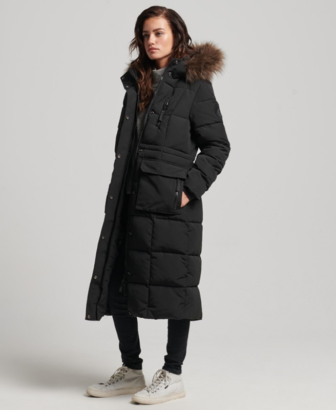 Superdry dámská zimní bunda Longline Faux Fur Everest Coat - Black