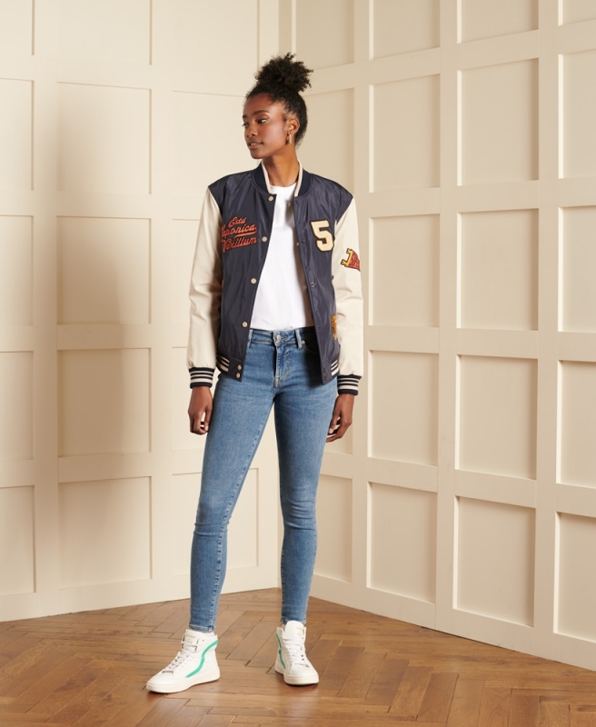 Dámské rifle značky Superdry. Kalhoty se středně vysokým pasem mají skinny střih, zapínání na zip a knoflík a čtyři kapsy.