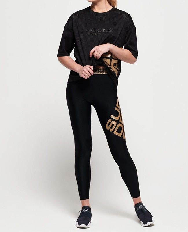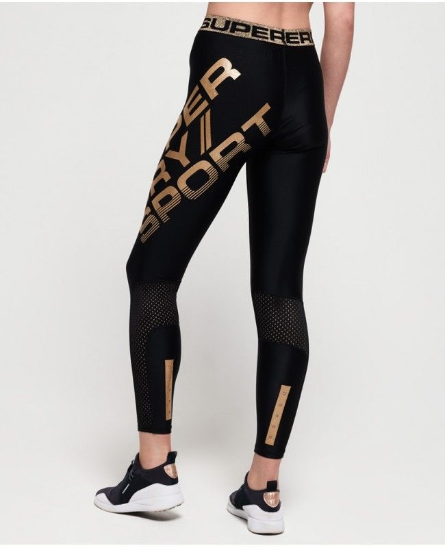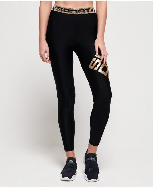 Dámské sportovní legíny Superdry Bolt Sport. Legíny jsou vyrobeny z prodyšného elastického materiálu. Ve spodní zadní části legín je použita síťovaná tkanina. Legíny jsou zdobeny třpytivým metalickým logem Superdry Sport.